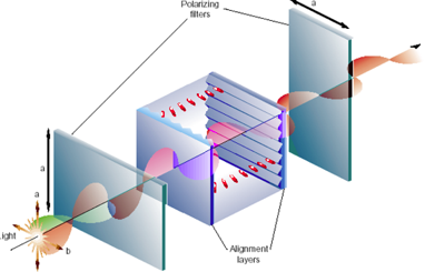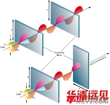 • 偏光板的特性:將非偏極光(一般光線)過(guò)濾成偏極光。當(dāng)非偏極光通過(guò)a方向的 偏光片時(shí),光線被過(guò)濾成與a方向平行的線性偏極光。當(dāng)然如果非偏極光通過(guò)b方向的偏光片時(shí),光線會(huì)被過(guò)濾成與b方向平行的線性偏極光。如下圖:圖1中非偏極光通過(guò)第一塊a方向的偏光片后,被過(guò)濾成a方向平行的線性偏極光,并且能順利通過(guò)第二張a方向的偏光片。圖2中非偏極光通過(guò)第一塊a方向的偏光片后,要通過(guò)第二塊偏光片時(shí),發(fā)現(xiàn)第二塊偏光片被旋轉(zhuǎn)了90度,此時(shí),就無(wú)法通過(guò)了。