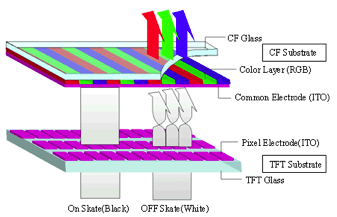 c、不同顏色的顯示:要顯示不同的顏色只需要控制Pixel Electrode(像素電極)即可。