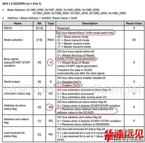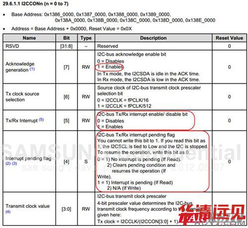 當4412的I2C接口空閑時,它往往工作在從機模式。或者說,4412的的i2c接口在SDA線上察覺到一個起始信號之前它應該工作在從機模式。當控制器改變4412的i2c接口的工作模式為主機模式后,SDA線上發(fā)起數(shù)據(jù)傳輸并且控制器會產(chǎn)生SCL時鐘信號。