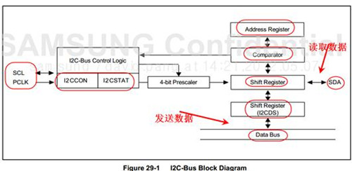 從上圖可以看出,4412提供4個寄存器來完成所有的IIC操作。SDA線上的數(shù)據(jù)從IICDS寄存器經(jīng)過移位寄存器發(fā)出,或通過移位寄存器傳入IICDS寄存器;IICADD寄存器中保存4412當做從機時的地址;IICCON、IICSTAT兩個寄存器用來控制或標識各種狀態(tài),比如選擇工作工作模式,發(fā)出S信號、P信號,決定是否發(fā)出ACK信號,檢測是否接收到ACK信號。
