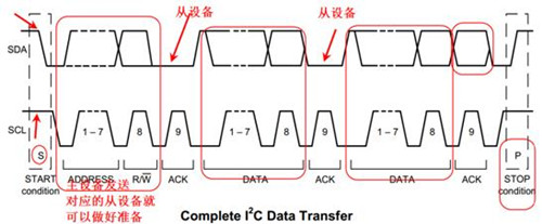 開始條件通過SDA線進行串行的字節(jié)傳輸,一個停止信號終止數(shù)據(jù)傳輸,停止信號是指SCL在高電平器件SDA線有從低到高電平的跳變,主機端產(chǎn)生起始和停止條件。當主、從設備產(chǎn)生一個起始信號后,I2C總線將進入忙狀態(tài)。這里需要說明的是上述主從設備都有可能作為主機端。