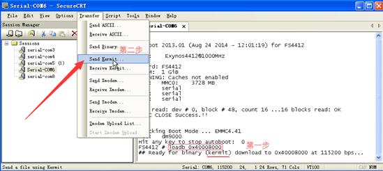 然后在串口工具上選擇transfer菜單里的send kermit選項(xiàng)