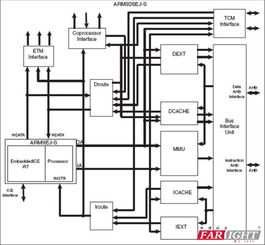 二.處理器ARM926EJ-S介紹 ARM926EJ-S是通用微處理器ARM9家族中的一員,屬于V5TEJ版ARM架構,針對的是多任務應用,全存儲器管理、高性能、小核心尺寸和低功耗都是它的特點。 ARM926EJ-S處理器支持32位ARM和16位THUMB指令集,使得用戶能在高性能和高代碼密度上取得平衡。它支持8為JAVA指令集并且包括Java字節代碼有效執行的功能部件,提供和JIT(Just In Time編譯器)形似的Java性能,這些性能為下一代Java無線應用和嵌入式的設備提供了有效支持。為了提高DSP性能,還包含了一個增強的乘法器設計。 ARM926EJ-S提供了一個完整的處理器子系統,包括: