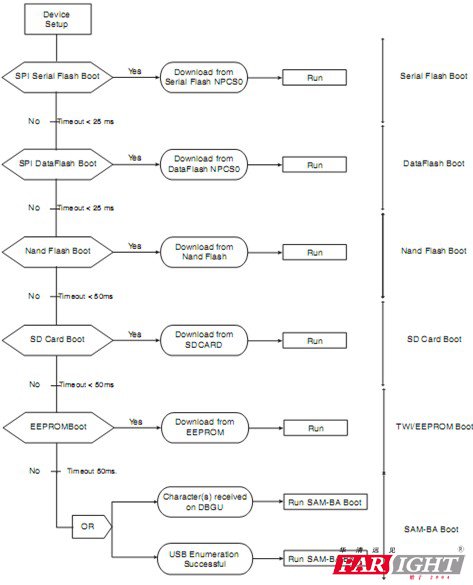 AT91SAM9261芯片的內部ROM中固化了一段啟動代碼,如果BMS引腳電平為1,則執行這段啟動代碼。啟動代碼會檢測和芯片連接的外部的各個存儲媒介(SPI DATAFLASH, NAND FLASH or SDCARD)上是否有有效的應用程序,如果有,則把它下載到內部快速SRAM中去運行;如果沒有發現有效的應用程序,則執行SAM-BA應用程序,SAM-BA是一種小型監控程序接口,也是固化在ROM中的程序。它實現以下功能: 用戶可以通過PC端的SAM-BA GUI程序通過USB或者串口下載有效的應用到外部存儲器(DATAFLASH,NAND FLASH or SDCARD) 啟動程序算法流程圖如下所示: