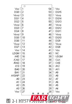 二、HY57V561620 SDRAM介紹 1、HY57V561620的結構 HY57V561620存儲容量為4M×4bank×16位(32M字節),工作電壓為3.3V,常見封裝為54腳TSOP,兼容LVTTL接口,支持自動刷新(Auto-Refresh)和自刷新(Self-Refresh),16位數據寬度。 HY57V561620引腳分布如圖2-1所示。