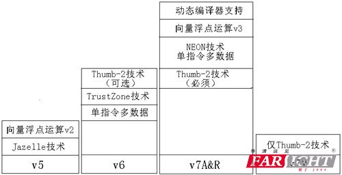 眾所周知,英國的ARM公司是嵌入式微處理器世界當中的佼佼者。ARM一直以來都是自己研發微處理器內核架構,然后將這些架構的知識產權授權給各個芯片廠商,精簡的CPU架構,高效的處理能力以及成功的商業模式讓ARM公司獲得了巨大的成功,使他迅速占據了32位嵌入式微處理器的大部分市場份額,甚至現在,ARM芯片在上網本市場的也大有與INTEL的ATOM處理器一較高低的實力。 目前,隨著對嵌入式系統的要求越來越高,作為其核心的嵌入式微處理器的綜合性能也受到日益嚴峻的考驗,典型的例子就是伴隨3G網絡的推廣,對手機的本地處理能力要求很高,現在一個高端的智能手機的處理能力幾乎可以和幾年前的筆記本電腦相當。為了迎合市場的需求,ARM公司也在加緊研發他們新的ARM架構,Cortex系列就是這樣的產品。在Cortex之前,ARM核都是以ARM為前綴命名的,從ARM1一直到ARM11,之后就是Cortex系列了。Cortex在英語中有大腦皮層的意思,而大腦皮層正是人腦核心的部分,估計ARM公司如此命名正有此含義吧。 一.ARMv7架構特點 下表列出了ARM微處理器核心以及體系結構的發展歷史: