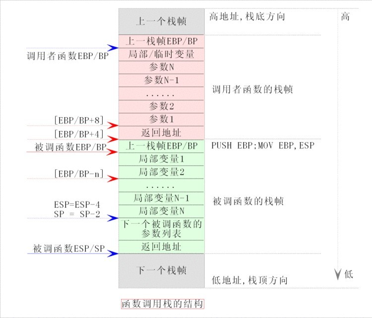 匯編/C語(yǔ)言中的'數(shù)據(jù)棧'跟數(shù)據(jù)結(jié)構(gòu)中的'邏輯棧'類(lèi)似都是遵循先進(jìn)后出后進(jìn)先出原則,但是在實(shí)際操作過(guò)程中的基本單位不同: 1.在數(shù)據(jù)結(jié)構(gòu)中的'邏輯棧'按照使用者自己的需求定義大小及基本單位。例如可以存放10個(gè)char型,也可以存放20個(gè)結(jié)構(gòu)體等。 2.在匯編或C語(yǔ)言本身的'數(shù)據(jù)棧'中棧大小由編譯器指定,遵循FIFO規(guī)則的基本單位是棧幀,即每調(diào)用一個(gè)函數(shù)都會(huì)有一個(gè)新的棧幀加入,而函數(shù)返回則以棧幀為單位出棧。 棧幀也叫過(guò)程活動(dòng)記錄,是編譯器用來(lái)實(shí)現(xiàn)過(guò)程/函數(shù)調(diào)用的一種數(shù)據(jù)結(jié)構(gòu)。其實(shí)就是一個(gè)函數(shù)執(zhí)行的環(huán)境:函數(shù)參數(shù)、函數(shù)的局部變量、函數(shù)執(zhí)行完后返回到哪里等等。 因此,在同一個(gè)棧幀內(nèi)數(shù)據(jù)的訪(fǎng)問(wèn)可以使隨機(jī)的,匯編中可以通過(guò)ebp 指針向上或向下任意偏移就可以訪(fǎng)問(wèn)當(dāng)前函數(shù)內(nèi)部的所有局部變量,或向上偏移就可以訪(fǎng)問(wèn)調(diào)用者對(duì)當(dāng)前函數(shù)的傳參。(因?yàn)闂5脑鲩L(zhǎng)空間是從高地址到低地址。) 下面是函數(shù)調(diào)用過(guò)程中的操作: 當(dāng)發(fā)生函數(shù)調(diào)用的時(shí)候,棧空間中存放的數(shù)據(jù)是這樣的: 1、調(diào)用者函數(shù)把被調(diào)函數(shù)所需要的參數(shù)按照與被調(diào)函數(shù)的形參順序相反的順序壓入棧中,即:從右向左依次把被調(diào)函數(shù)所需要的參數(shù)壓入棧; 2、調(diào)用者函數(shù)使用call指令調(diào)用被調(diào)函數(shù),并把call指令的下一條指令的地址當(dāng)成返回地址壓入棧中(這個(gè)壓棧操作隱含在call指令中); 3、在被調(diào)函數(shù)中,被調(diào)函數(shù)會(huì)先保存調(diào)用者函數(shù)的棧底地址(push ebp),然后再保存調(diào)用者函數(shù)的棧頂?shù)刂?即:當(dāng)前被調(diào)函數(shù)的棧底地址(mov ebp,esp); 4、在被調(diào)函數(shù)中,從ebp的位置處開(kāi)始存放被調(diào)函數(shù)中的局部變量和臨時(shí)變量,并且這些變量的地址按照定義時(shí)的順序依次減小,即:這些變量的地址是按照棧的延伸方向排列的,先定義的變量先入棧,后定義的變量后入棧; 所以,發(fā)生函數(shù)調(diào)用時(shí),入棧的順序?yàn)?