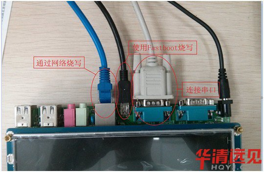 1.1. 使用Fastboot方式燒寫 在安卓手機中Fastboot是一種比Recovery更底層的刷機模式。Fastboot是一種線刷,就是使用USB數據線連接手機的一種刷機模式。相對于某些系統卡刷來說,線刷更可靠,安全。 Fastboot工具在光盤的“工具軟件\Windows\Fastboot\Fastboot”下,為了方便把他解壓到D盤。 1.1.1. 安裝Fastboot驅動 第一次使用Fastboot需要安裝驅動,驅動位置在“工具軟件\Windows\Fastboot\Fastboot驅動”下。按下圖連接開發板串口和USB口。