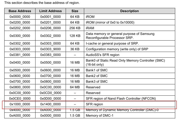 查看Exynos4412芯片手冊(cè)的第二章2 Memory Map(30頁(yè))地址映射表,我們可以看到Exynos4412的特殊功能寄存器絕大部分都放到了0x1000_0000到0x1400_0000的地址空間。