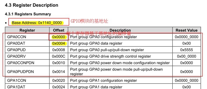 查看芯片手冊(cè),第四章4 General Purpose Input/Output (GPIO) Control,4.3節(jié)(41頁(yè))寄存器描述,有完整的GPIO模塊的寄存器描述表。我們可以得到GPIO模塊的基地址和每個(gè)寄存器相對(duì)基地址的偏移量。