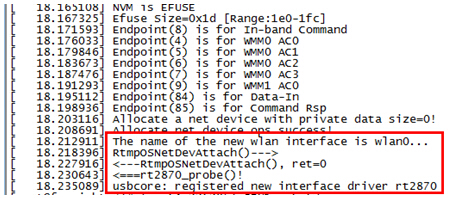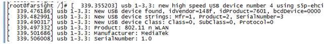 將USB-Wifi模塊插到開發板的USB接口上,可以在端口上看到如下打印信息