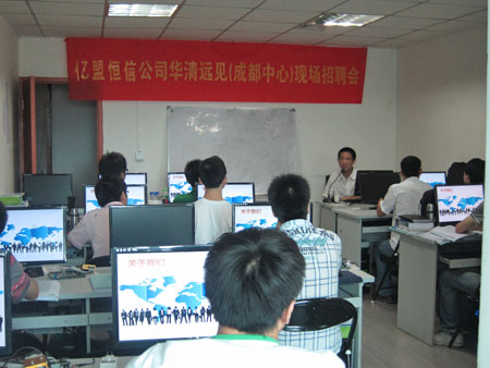 在通過對華清遠見的接觸了解,并結合之前入職公司的學員表現情況,成都億盟恒信科技有限公司于2011年8月31日搶先來到了成都中心,對在校1105期學員進行了三個多小時的現場招聘活動。當天來到中心負責招聘的兩位負責人分別是公司潘總以及招聘負責人江小姐。本次招聘受華清遠見成都中心的熱烈歡迎,中心負責人陶老師以及教學潘老師等分別與兩位負責人進行了友好的交談。