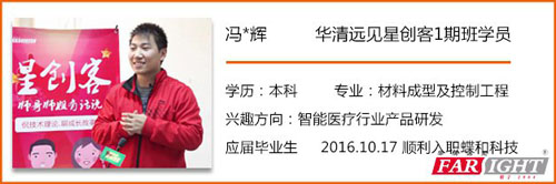應屆生“輝輝”鐘情智能醫療行業 Part 1 輝輝細數1期班全班同學在星創客的點點滴滴 輝輝一定是一個有情懷的漢紙,因為畢業2個多月了,他對同窗好友們的座位分布和學習狀態如數家珍,點滴話語中透露出他對那段拼搏的時光無比懷念: “搞技術很牛X的“張導”,被大家視為全班零食店的女同學,瘋狂學驅動的“老牛”,逗逼青年“李逗比”,渴求知識而繼續深造的“小松同志”,在Linux和Android造詣極高的“猛哥”,3天搞完物聯網項目整個流程的“楊同學”,進行二次深造的“白大俠”,Android方面的大牛“另一個張導”,心思縝密用云筆記整理思路的王同學,不到一個月時間搞出畢業設計“戰神”,能一個人從應用層寫到底層的大牛“韓導”,在上海做前景很好的驅動相關工作的“栗子”,整天上課調皮搗蛋的自己,做圖像處理和算法控制的技術大咖黃同學,出口成詩的班長,見多識廣的“宋老司機”……”