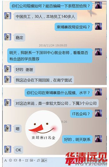 就在昨天,突然有柬埔寨的企業(yè)找到我們?nèi)A清遠見就業(yè)老師的聯(lián)系方式,聽聞華清遠見的培訓(xùn)很不錯,想找一些學(xué)員赴柬工作。有圖有真相,這家企業(yè)自稱是柬埔寨IT名企,本著對學(xué)員就業(yè)負責(zé)的態(tài)度,就業(yè)部老師將會近一步核實企業(yè)情況,才好推薦學(xué)員到該公司就業(yè)。對比IT行業(yè)發(fā)展如火如荼,IT人才劇增的今天,出國就業(yè)或許也是一種途經(jīng),但一定要掌握對方公司的詳細信息。據(jù)深圳校區(qū)就業(yè)老師反映,深圳中心曾有柬埔寨企業(yè)招聘,鑒于故土難離的想法沒能成行。