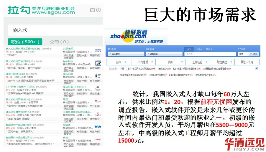 接著我們來看一下基本的嵌入式行業相關企業的招聘需求:下面是幾大主流招聘平臺上嵌入式工程師相關招聘崗位的需求情況。據統計,我國嵌入式人才缺口每年60萬人左右,供求比例達1:20,根據前程無憂網發布的調查報告,嵌入式軟件開發是未來幾年或更長的時間內熱門和受歡迎的職業之一,初級的嵌入式軟件開發人員,平均月薪也在5500—9000元左右,中高級的嵌入式工程師月薪平均超過15000元。相信隨著智能化電子產品的不斷發展,整個嵌入式行業人才需求的不斷加大,這個數字還會保持持續的增長。