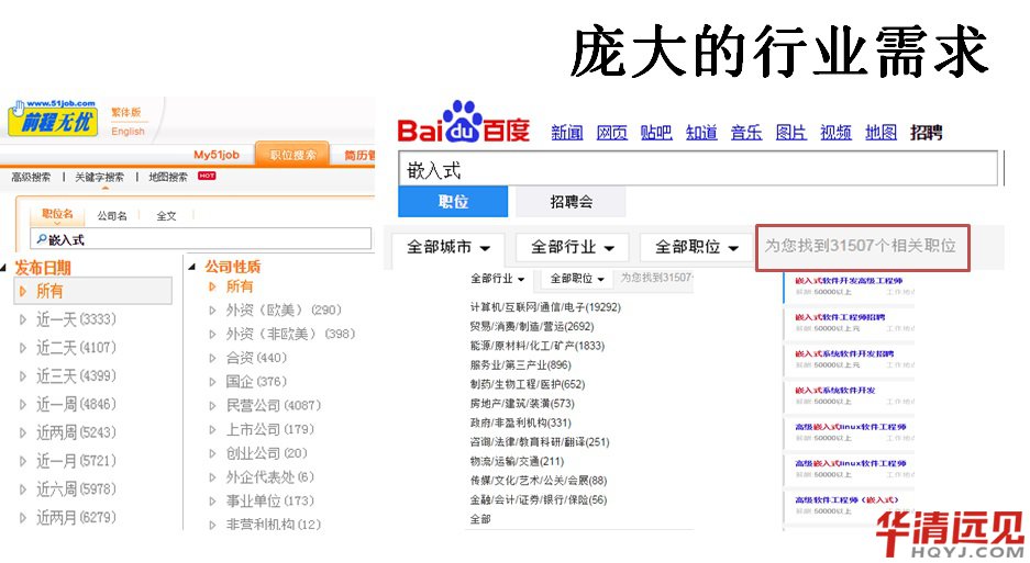 通過下圖所示的前程無憂及百度人才的全方面搜索了解,龐大的行業需求催生了嵌入式人才需求的井噴,各種類型的外資企業、臺資企業、國企、上市公司、創業行業、民營企業、事業單位等都有巨大的嵌入式人才需求。而這些嵌入式人才需求遍布于計算機/互聯網/通信電子行業、貿易/消費/制造/營運行業、服務業、生物制造行業、物流運輸/交通行業等。