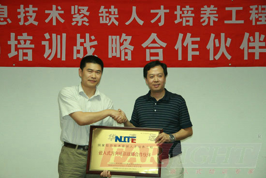 (圖一)左:華清遠見總裁季久峰, 右:CSIP副主任邱善勤博士 2009年7月31日,華清遠見嵌入式培訓中心與工業和信息化部軟件與集成電路促進中心(簡稱CSIP)簽署了合作協議,并舉行了隆重的合作伙伴授牌儀式。工業和信息化部軟件與集成電路促進中心副主任邱善勤博士、教育培訓部吳宏雷主任、華清遠見總裁季久峰及相關負責人出席了此次授牌儀式。自此,華清遠見正式成為信息技術緊缺人才培養工程(National Information Technology Education Project,簡稱NITE)培訓戰略合作伙伴。憑借多年在嵌入式專業領域內的卓越貢獻和權威地位,華清遠見也成為了首家獲NITE授權的嵌入式方向培訓機構。 信息技術緊缺人才培養工程(NITE)是由工業和信息化部直接指導,軟件與集成電路促進中心(CSIP)承擔并組織外眾多企業、研究機構和教育培訓機構,于2006年1月1日在全國范圍內啟動的緊缺人才培養項目,NITE定位于重點領域的緊缺人才培養。 NITE嵌入式培養是聯合中電網、清華大學等知名高等學府、多家著名電子技術提供商及華清遠見等專業培訓機構共同推出的首個級電子工程技術網上網下結合的培訓項目。該項目專門針對目前電子工程人才緊缺的現狀,旨在通過基礎理論學習與動手實踐相結合的方式,為電子工程技術人員提供系統學習前沿、熱門電子工程技術的機會。通過該培訓項目認證考試的工程師將獲得“信息技術應用技能證書”(電子工程與集成電路技術專業)。