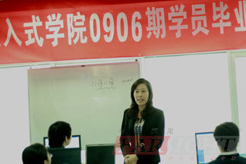 2009年10月27日,14:00時(shí),華清遠(yuǎn)見(jiàn)教育科技集團(tuán)北京總部0906期結(jié)業(yè)典禮隆重舉行。結(jié)業(yè)典禮當(dāng)天出席參加的華清遠(yuǎn)見(jiàn)教育科技集團(tuán)老師有:華清遠(yuǎn)見(jiàn)教育科技集團(tuán)的院長(zhǎng)季老師,副院長(zhǎng)賈老師,技術(shù)總監(jiān)劉老師及就業(yè)指導(dǎo)老師裴老師,整個(gè)典禮由班主任王老師主持。