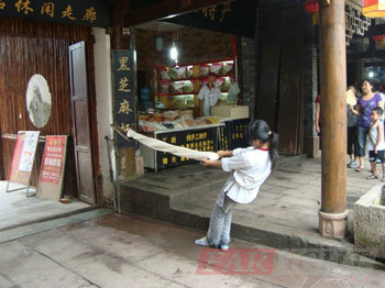 我們先是順溪而游。一路上,街道兩旁特色的小吃店,街道上一身穿著武大郎戲服,推車吆喝叫賣的“大郎燒餅”攤,名小吃麻糖的惹眼制作現場,城門的古鼎噴泉,形狀各異的老樹根藝,活字墻壁,到處具有濃郁鄉村古色氣息的建筑,一路吸引了我們大家的眼球,一路上大家拍照忙的不亦樂乎,爭相擺造型留念;還有各種精致的草繩手編的民間工藝品:有卷縮一團的蛇,展翅的蜻蜓,張牙舞爪的河蝦,好斗的公雞,黃蟲,壁虎,蟬,……一個個活靈活現,引得大家駐足觀賞,贊嘆不已……一晃三個小時過去了,我們下午還要“遠行”——剩船過河,登山拜佛!