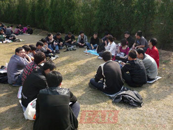 下了望京樓,從百望山沿石板路順西山坡到深谷處有一“紅葉仙子”石雕像,可環(huán)眺四周山峰。大家的下一個(gè)目的地就是紅葉仙子,山路陡峭,同學(xué)們相互攙扶,彼此小心囑咐安全。經(jīng)過一番跋涉,終于看到紅葉仙子的身影。同學(xué)們忙與仙子合影留念,并眺望前面一片綠草地,大家商議在此地開展我們的殺人游戲。 在殺人游戲中,我們?cè)诓粩嗟目偨Y(jié),不斷的思考,不斷的分析,哪位是殺手,哪位是警察?也在殺人游戲中,培養(yǎng)我們的邏輯分析能力,培養(yǎng)我們的團(tuán)隊(duì)合作能力。
