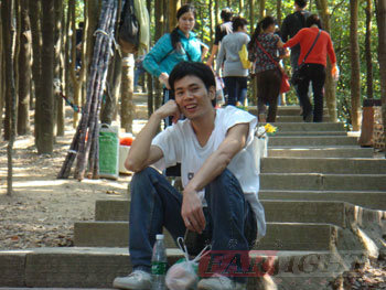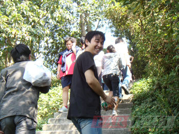 梧桐山是深圳河的發祥地,山高林密,鳥語清脆響徹耳邊,同時山茶花遍開山野,香氣襲人,爬山小徑上灑滿了從濃密的樹葉空隙里穿透下來的陽光斑點,點綴著路面,伴隨著上山、下山的人流,跳躍著,讓游人的腳步也輕松起來了。也許是太專注于學習而缺乏鍛煉,我們輕快的腳步越發的沉重起來,呼吸也變得急促了,聊天的歡笑聲也小了,開始感覺到每登一個階梯都比較吃力了。在半山腰就有同學發出疑問:“還有多高。俊迸赃叺耐瑢W給他鼓勁說:“快了,還有兩、三百級。我們休息一下,先補充一下能量。”大家一致同意,要勞逸結合,為了爬得更高,我們好好調整。于是,大家就在旁邊的空地,開始補充能量。休息了幾分鐘之后,大家的激情又回來了,相互鼓舞著:“走,上山!我們去征服這座高山!”。
