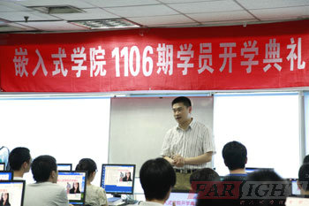 在王老師的講話結束后,由華清遠見教育科技集團院長季老師為開學典禮致辭,季老師對華清遠見教育科技集團的文化、發展歷程及授權合作單位進行了簡短的介紹,并對當前的關注熱點“物聯網”、“云計算”、“電子書”、“移動通訊設備”等進行分析,讓大家能夠充分感受到嵌入式行業的優勢和迅猛發展的現狀。同時季老師也鼓勵1106期的學員要努力學習,充分調動起自己的興趣和學習積極性,在華清遠見各位老師的幫助下,真正達到學有所成,終成為一名合格的嵌入式工程師。后季老師也給每位同學提出了幾點希望,希望同學們能夠迅速找到適合自己的學習方法,真正做到有質有量的學習。