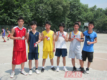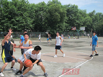 這次籃球比賽共分為兩隊,每隊各6名隊員,其中,第一隊的隊員里還包括我們的冉老師,裁判一名,記分員一名,其他學員和到場的老師組成啦啦隊。比賽是半場制,每隊派4名隊員上場。在正式比賽開始前,兩隊的隊長組織本隊成員開了個小會,做了戰(zhàn)略部署和人員安排。