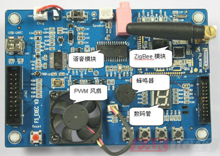 集成數碼管、ISD1760語音模塊、蜂鳴器、PWM風扇等,利用模塊與ZigBee主控單元的交互接收來自上級單元的命令并完成相應的操作。
