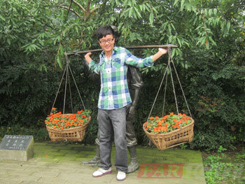 離開牛王廟,順著紫薇路向前走,然后右轉(zhuǎn)是水杉路,沿途大家發(fā)現(xiàn)了很可愛的無色雕塑,具有川西風格的農(nóng)家樂。有不少在農(nóng)家樂辦喜宴和壽宴的人家,一派喜洋洋、樂融融的景象。繼續(xù)前行,我們還看到了酒吧,吉他店,小工藝品店等等。有學員忍不住進入工藝品店挑選小禮品,其他學員則在店外休息。休息過后,我們繼續(xù)前行,這時一位來自北方的學員指著樹上的柚子問:“這是什么花呢?”這一問,樂壞了旁邊的同學,一邊笑,一邊解釋:“哥們,這可是貨真價實的柚子樹啊!”