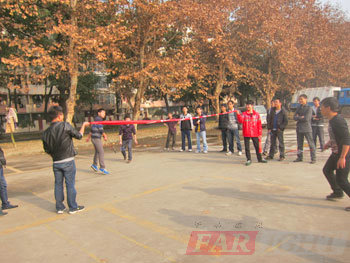 接著,進行的是羽毛球的自由組合比賽。考慮到時間的因素以及場地就近原則,就在乒乓球臺旁邊空出的停車場舉行,我們的學員別出心裁的拿出了活動橫幅拉起了一張會動的網,而我們的隊員有的是臨時組合,有的是經常在一起打球,這樣很快就淘汰了兩組,剩下了三組,進行輪賽,其中張鵬和丁明配合的很默契,連勝兩場,取得了羽毛球比賽的勝利。