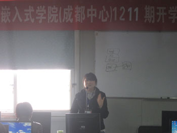 2012年11月19日,華清遠見教育科技集團成都中心1211期學員開學典禮在嵌入式實驗室805隆重舉行。出席本次開學典禮的老師有成都中心校長陶老師,教學部的潘老師、朱老師、品質保障部的黃老師、龔老師等。