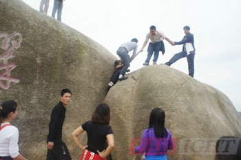 經(jīng)過(guò)了一段艱苦的爬行后,終于到達(dá)了山頂。學(xué)員們都興奮的在呼叫,貪婪的呼吸著新鮮空氣,飽覽著迷人的景色:往東邊遠(yuǎn)望,群山連綿起伏,好似奔騰的綠浪。而西邊呢,高樓聳立,路上的車(chē)輛川流不息。俯視,水庫(kù)的全景盡收眼底,草是綠的,水是綠的,樹(shù)是綠的,真是一片綠意。大伙們登頂成功的喜悅情不自禁地化為了吶喊與歡呼,那時(shí)那刻,大家喜悅歡呼、爭(zhēng)相合影留念,留住這美麗瞬間。