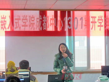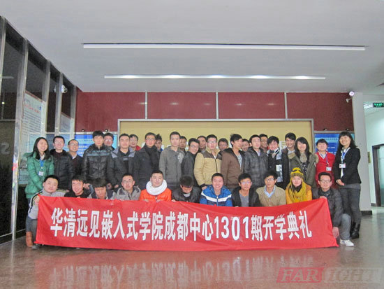 在嶄新的2013年,華清遠見教育科技集團成都分中心迎來了新年的第一批學員。1月14日上午,1301期開學典禮在成都中心所在的四川大學大學科技園610教室里隆重舉行。成都中心校長陶老師,學術經理潘老師,教學部馮老師及王老師,就業專員黃老師,班主任張老師以及1301期全體學員出席了開學典禮。