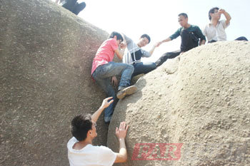 早上九點,大家準時在教室集合,九點半乘坐公共汽車前往目的地,車廂里一片歡騰聲,欣賞沿途的風景,或是相互交流,或是給老人讓座,很快就到達了羊臺山入口,有曾經爬過的,開始淡定的前往,聽別人說很容易爬的,也開始他們輕快的腳步,就這樣三五成群,邁開了向頂峰挺進的第一步。