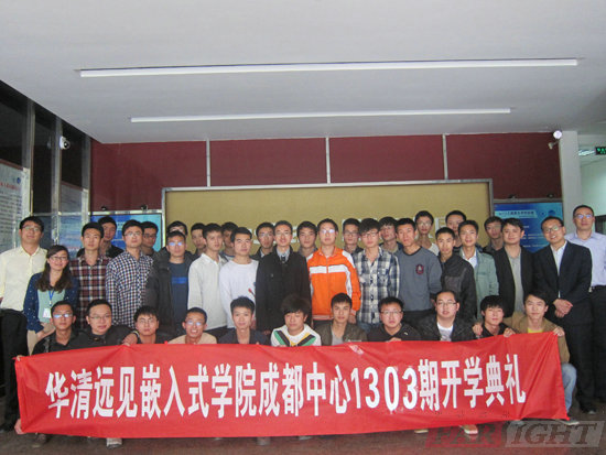 上午9時,伴隨著熱烈的掌聲,開學典禮正式開始。首先,成都分中心校長陶老師代表華清遠見教育科技集團的全體工作人員對1303期新學員的到來表示由衷的歡迎。作為嵌入式行業資深的職業規劃師,陶老師結合自己多年在嵌入式領域的工作經驗,深入的分析了嵌入式行業的專業前景及發展方向。他給學員們展示了華清遠見成立背景,剖析了嵌入式系統的發展歷程及系統構成、嵌入式行業占有率分布及開發人員薪資狀況。他期望每一位學員都能在華清遠見教育科技集團老師的正確引導下付出大的努力,養成一個良好的學習習慣,堅持不懈的朝著自己的目標前進。同時,他也祝愿大家在這四個月中學有所獲,在收獲技能的同時能夠積累下自己的人脈關系。