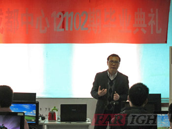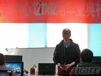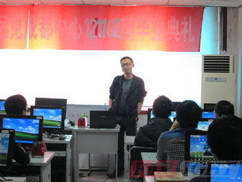 下午3點,畢業典禮正式開始。典禮首先由成都中心校長陶老師致辭。陶老師首先對學員們取得的成績表示肯定,然后分享了自己找工作過程中的經驗,指出專業知識技能,心態,自信等在找工作過程中的重要作用。后,他送上了自己對121102期學員們美好的祝愿:希望學員們早日找到滿意的工作。
