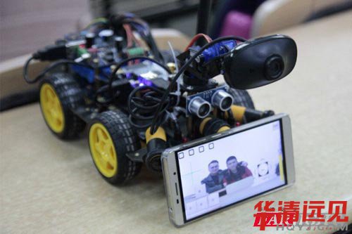 本次活動(dòng)大的主角莫過于華清遠(yuǎn)見自主研發(fā)的智能小車,這款小車說起來那可真是不簡單!在華清遠(yuǎn)見嵌入式課堂上就已經(jīng)受到了眾多學(xué)員的追捧。用戶不僅能利用Android手機(jī)通過無線網(wǎng)絡(luò)控制小車移動(dòng)、轉(zhuǎn)向,還能通過攝像頭采集視頻流,實(shí)時(shí)顯示在手機(jī)客戶端;通過Android手機(jī)控制端界面相應(yīng)操作進(jìn)行拍照,使用存儲(chǔ)設(shè)備進(jìn)行存儲(chǔ)。在現(xiàn)場(chǎng),華清遠(yuǎn)見講師苗老師首先向大家展示智能小車的強(qiáng)大功能,然后結(jié)合Linux、Andriod、嵌入式軟硬件開發(fā)等技術(shù),進(jìn)行了細(xì)致生動(dòng)地講解,并向大家介紹了當(dāng)前市場(chǎng)上相關(guān)的產(chǎn)品及設(shè)計(jì)趨勢(shì)。苗老師還介紹說,華清遠(yuǎn)見目前已經(jīng)開發(fā)出了智能手表、智能小車、智能手環(huán)、四旋翼飛行器、智能電視機(jī)頂盒等一系列智能產(chǎn)品,并已經(jīng)投入到教學(xué)中,通過真正的產(chǎn)品來學(xué)習(xí)開發(fā),讓學(xué)習(xí)更有趣。同學(xué)們聽的十分投入,并親手操縱小車感受其無窮的樂趣。