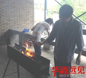 時間過的很快,中午12點了,大家回到自助燒烤區域,桌子上已經擺好了工具、飲料、食物、油鹽等作料,炭爐已經開始準備生火,洗完菜的同學把腌制好的雞翅、火腿也都一并串上,燒烤活動正式開始……