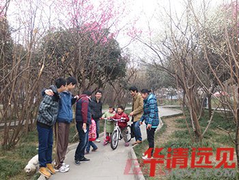 路邊的梅花開的熱鬧,引來了不少游客,其中有幾個小朋友很特別,不同于成 人們賞花游園,他們是帶著心愛的小狗狗,騎著自行車穿梭于賞花的人群中。學員們看到這些小寶貝,忍不住要逗逗他們,假裝擋住去路。小家伙們看到這情況著急 了,討好的喊哥哥姐姐好,惹得大家哈哈大笑。告別可愛的小朋友,我們繼續前行。