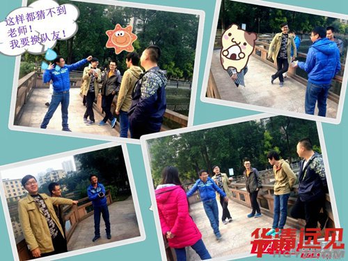 來到華清已有兩月之久,大家早已彼此熟悉,無需多言多語,一到便開始自發組隊游戲了。玩撲克的、下五子棋的、玩你來比劃我來猜的、閑逛看風景的、還有三三兩兩扎堆聊人生聊理想的,大家玩得不亦樂乎。順便說一下,下面那兩位扭秧歌的同學,我是不會承認他們是我的學生的,我不認識他們,不認識,不認識,重要的事情要說三遍!