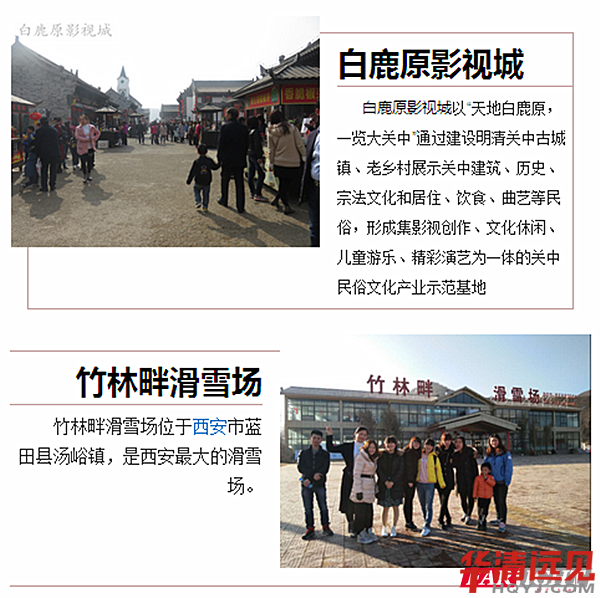 春游路線:白鹿原影視基地+竹林畔滑雪場VS民俗村(二選一)+湯峪碧水灣+大興遺址公園VS湯峪湖森林公園VS東峰山(三選一)。