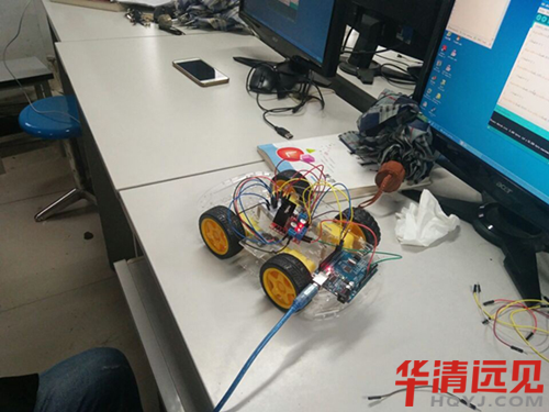 這次的實訓項目是智能小車,一周的實訓課程,在華清專業老師的指點下,同學們短短幾天就完成了屬于自己的智能小車項目,還可以通過手機藍牙連接小車,控制小車的行駛速度和方向,看著小車自如的旋轉加速,大家都開心不已。