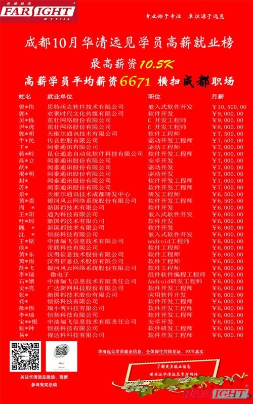 看,華清遠見十月份成都畢業學員薪資高能達到10.5K,高薪就業學員平均薪資也在6671元(這可是成都的哦!)。看帖的你是不是也在羨慕嫉妒,如果是,請不要停留在口頭上,華清遠見每年都在招收大三大四的新學員,想成為高薪族的一員,那就來華清遠見吧,我們幫你成就高薪的夢想。 更真實的信息看下邊!