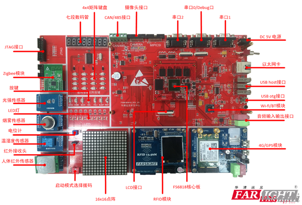 華清遠見提供了兩種學習平臺,一種是綜合實驗箱FS_6818B,板載資源比較多,可供實驗的例程多,可適合物聯(lián)網和嵌入式專業(yè)的深度研究和相關產品的開發(fā)。