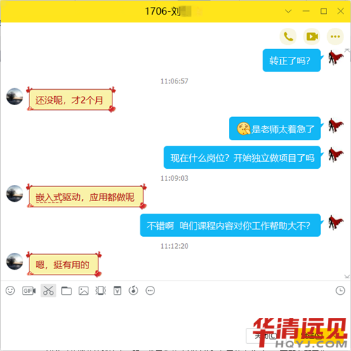在學習中和工作中,對嵌入式有了一定的了解,對自己有了清晰的認識,總的來說就是有熱情,有較強的知識接受能力,但在所接觸的這個大的知識體系中有點有力使不上的感覺,知識體系不完善。希望來到華清能完善我的知識體系,最主要的是對我有一個引導,包括技術上的和奮斗方向上;能和志同道合者一起學習,一起工作。