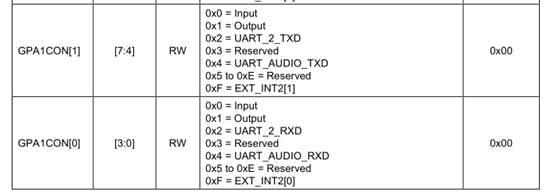 配置GPA1CON就可以了,需要把GPA1_0和GPA1_1配置成UART模式,對應的是UART2