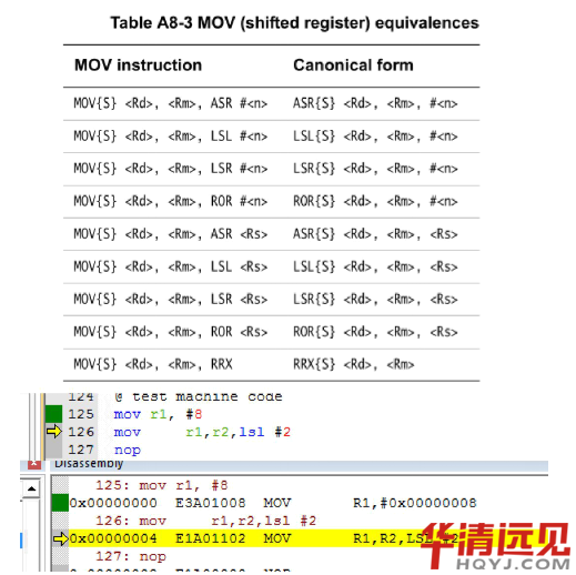 指令中的立即數是由一個 8 bit 的常數移動 4 bit 偶數位(0, 2,4, …, 26, 28, 30)得到的。所以,每一條指令都包含一個 8 bit 的常數 X 和移位值 Y,得到的立即數=X 循環右移(2×Y)