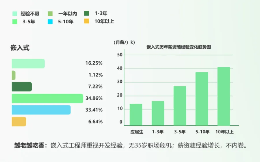 當然,所謂的“35歲+年齡危機”也在裁員事件中讓很多在職者陷入職場焦慮。相反,嵌入式領域及相關崗位對于工作經驗豐富的職場人士更為友好。