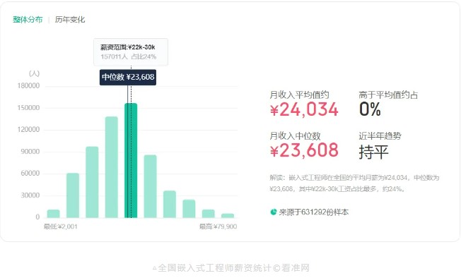 智能化時代,各行業減員的同時,嵌入式行業人才需求正逐步擴增。據官方統計顯示,全國嵌入式工程師月平均薪資可達24034元,其中22K-30K的人數最多。