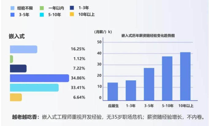 同時,嵌入式工程師非常注重開發經驗,因此不存在35歲年齡危機,薪資隨著工作經驗的不斷豐富呈現走高趨勢。